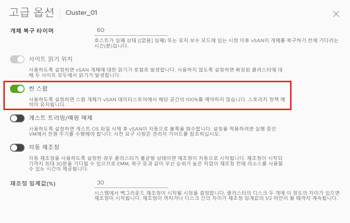 (2) 기본적으로 vSAN은 스왑 파일을 Thick Provisioning으로 설정하여 예상되는 최대 크기만큼 공간을 미리 확보하지만, 공간 효율성을 위해 Thin으로 설정하여 필요한 공간만 확보할 수 있도록 활성화 가능하다.