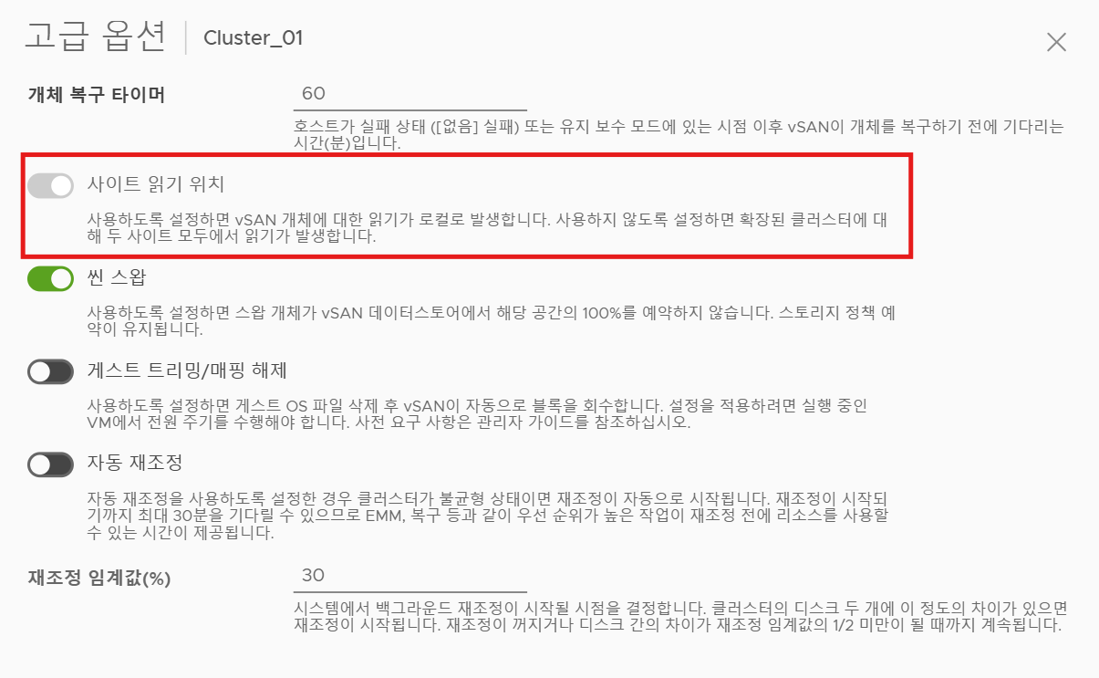 (1) 해당 옵션은 Stretched Cluster(확장된 클러스터)가 구성되어 있을 경우에 Enable 가능하다.