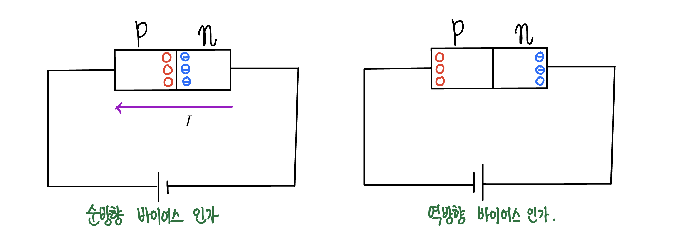 - 애노드에 양(+) 전압, 캐소드에 음(-) 전압이 인가되어 전류가 흐르는 상태를 순방향(Forward) 바이어스가 인가되었다고 합니다.