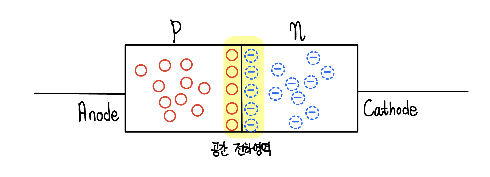 - P형 영역에 연결된 전극을 애노드(Anode), N형 영역에 연결된 전극을 캐소드(Cathode)라고 합니다.
