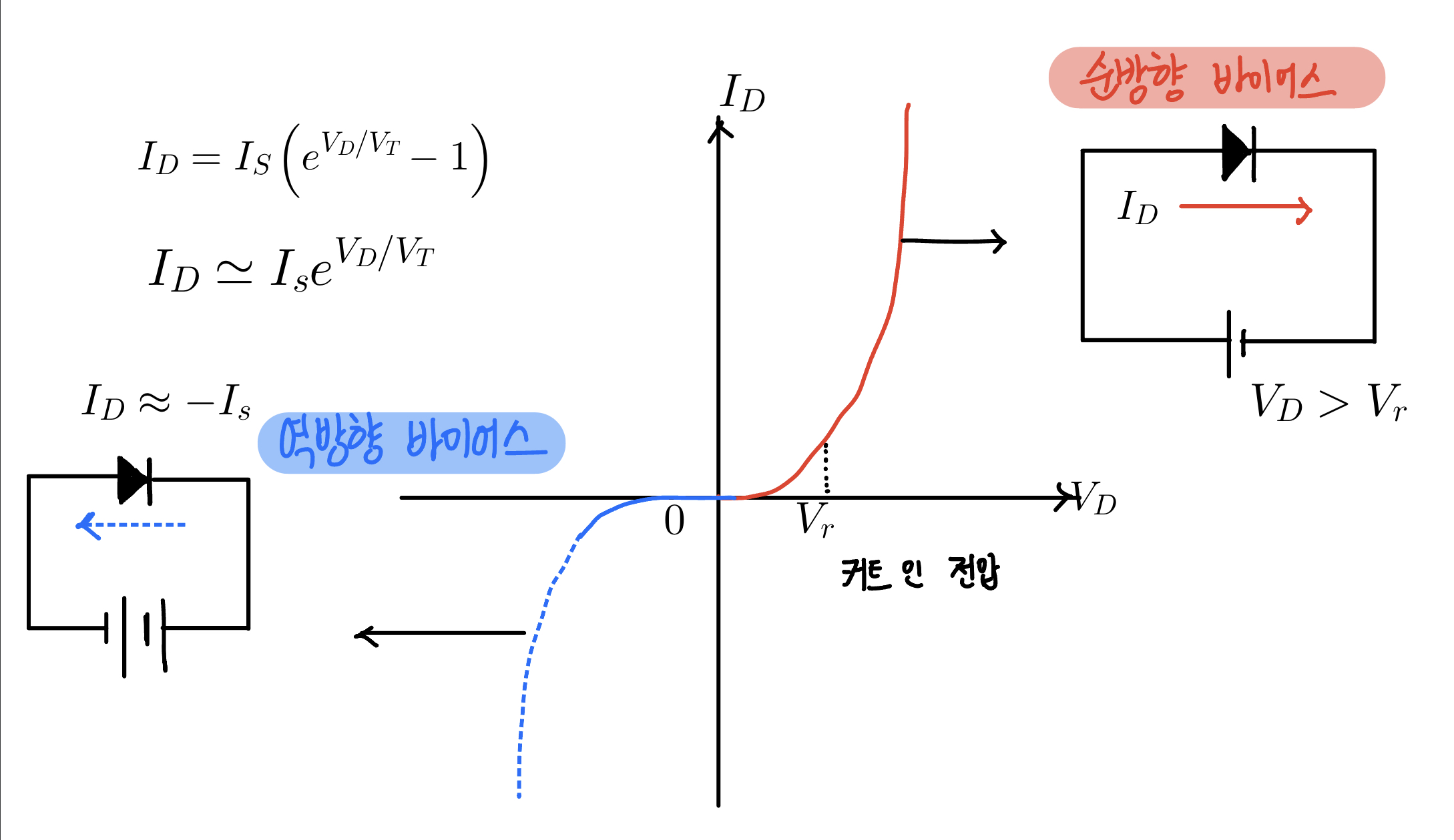 - 순방향 전압이 인가되면 다이오드의 전류는 위의 그래프와 같이 지수함수적으로 급격히 증가합니다.