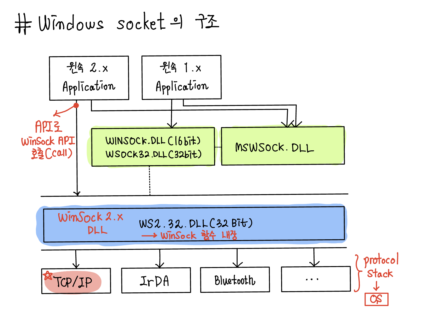 - 윈도우 소켓은 DLL을 통해 대부분의 기능이 제공되므로 DLL 초기화 종료 작업을 위한 함수가 필요합니다.