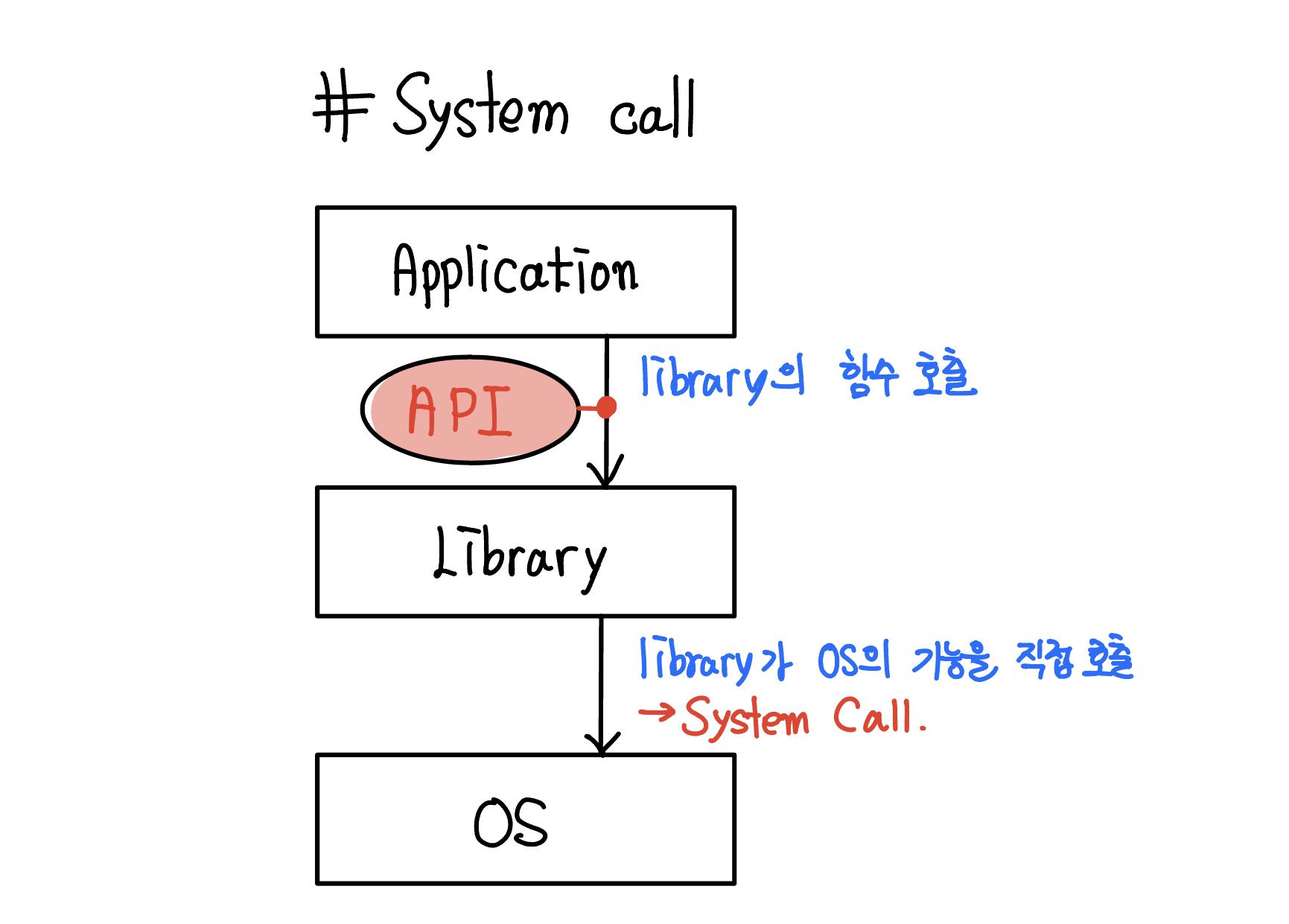 - 운영체제에서 시스템 호출, 즉 시스템 콜(System call)이란 간단히 설명하면 운영체제의 커널이 제공하는 서비스에 대해 응용 프로그램의 요청에 따라 커널에 접근하기 위한 인터페이스를 의미합니다. 시스템 호출에 대해서는 운영체제에 관한 내용을 다룰 때 자세히 포스팅하도록 하겠습니다.