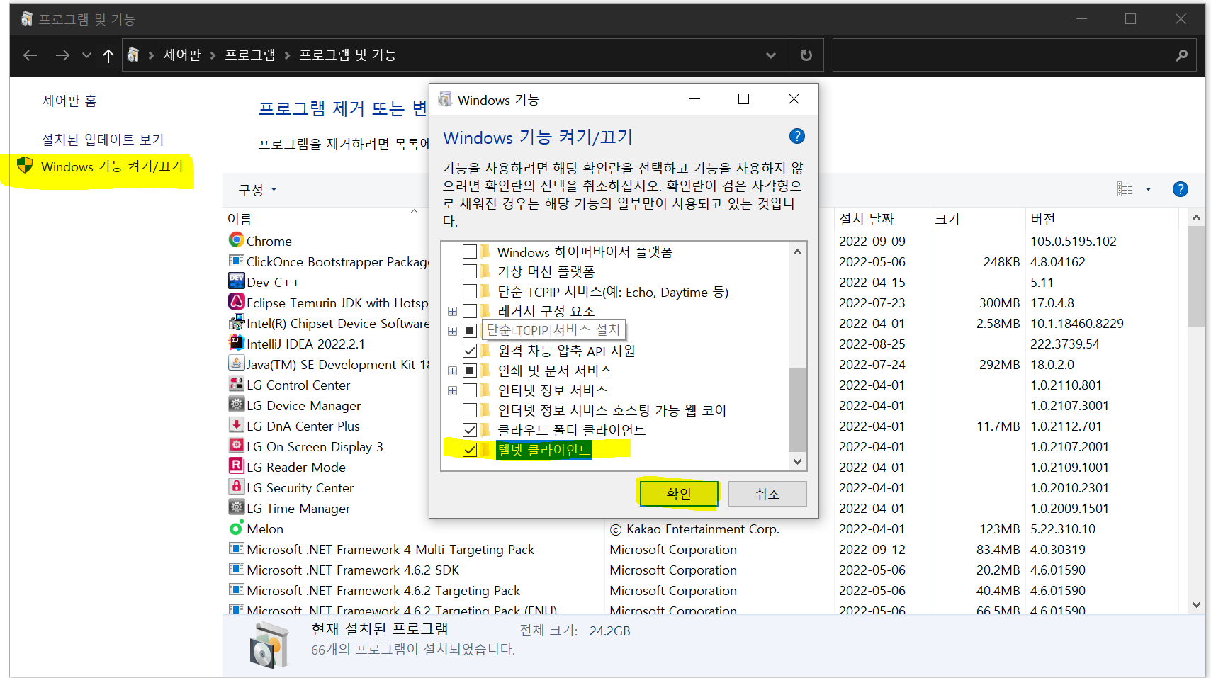 - 나타나는 상자에서 텔넷 클라이언트 항목에 체크하고 확인을 누릅니다.