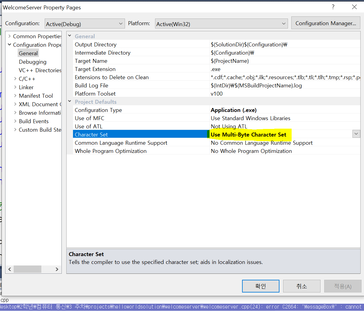 이 부분은 아래와 같이 프로젝트의 속성에서 Character Set > Multi-byte code 사용으로 속성값을 변경해 줍니다.
