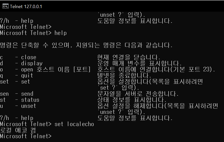 - 클라이언트에서 입력되는 값을 사용자가 보기 위해 set이라는 명령어를 사용할 것이며 set localecho를 입력하면 아래와 같이 로컬 에코가 작동된다는 메시지가 출력됩니다 이후 키보드의 엔터키를 눌러서 명령어 입력 콘솔을 빠져나옵니다.