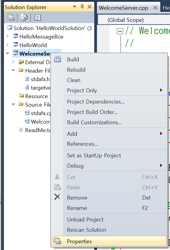 Solution Explorer 경로에서 프로젝트를 우클릭하고 아래의 properties에 접근합니다.
