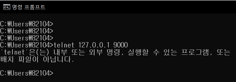 - 그러나 윈도우에서 기본적으로 telnet을 활성화시키지 않았기에 아래와 같은 메시지가 출력됩니다.