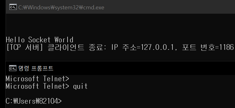 - Command prompt를 아래와 같이 실행한 후 telnet 127.0.0.1 9000을 입력합니다.
