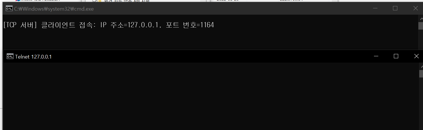 이후 Command prompt를 재실행하고 telnet 127.0.0.1 9090을 입력하고 실행하면 아래와 같이 서버 콘솔화면에 클라이언트가 접속했다는 문구가 출력됩니다.