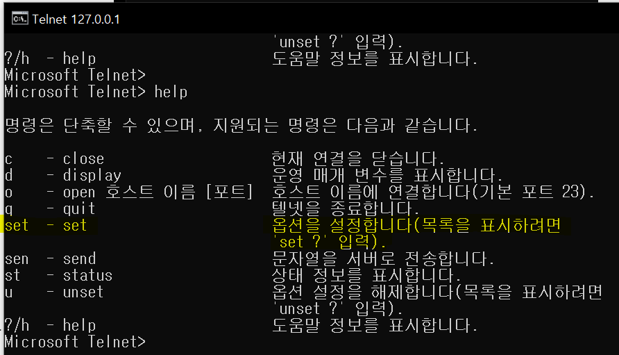 - 키보드에서 Ctrl + ] 를 입력하면 입력을 받는 과정을 잠시 멈추고 Telnet 명령어를 줄 수 있는 화면으로 넘어가게 되며 명령어 help를 입력하면 사용 가능한 Telnet의 명령어들의 리스트가 노출됩니다