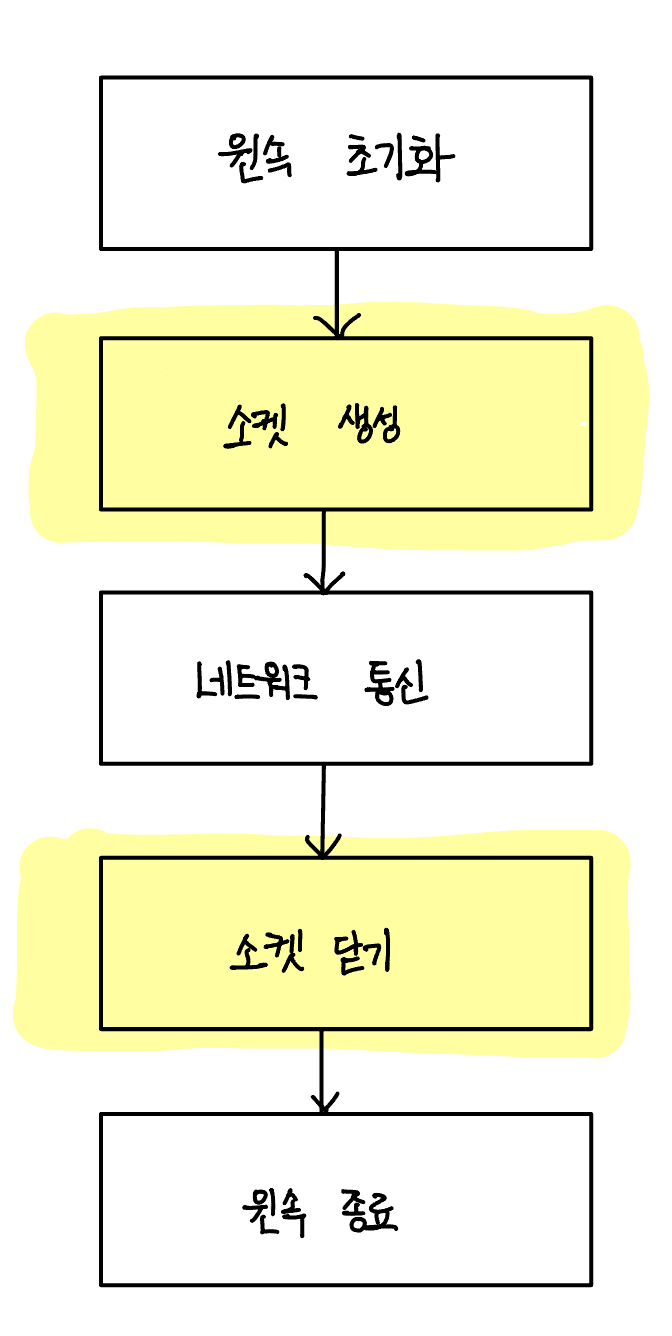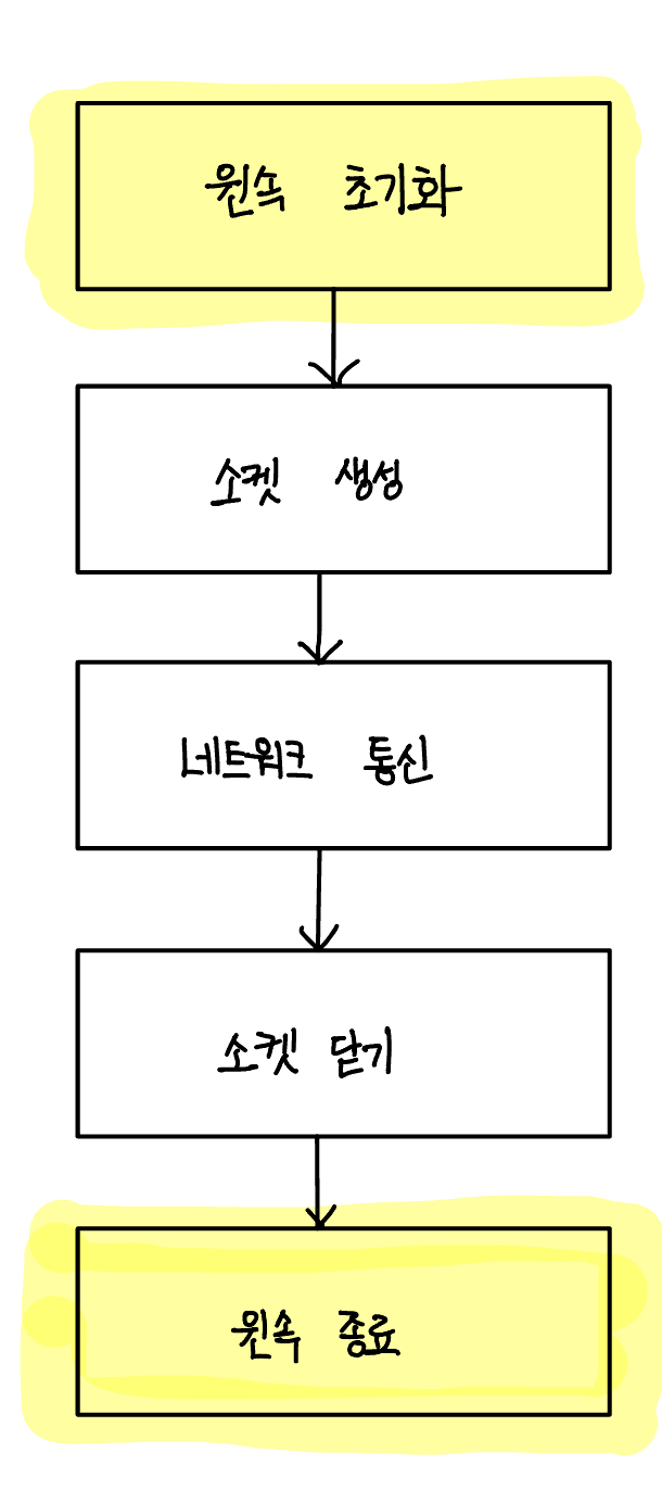 아래 그림은 모든 윈속 응용 프로그램의 공통 구조를 나타냅니다. 2번에서는 윈속의 초기화와 종료 방법을 알아보겠습니다.