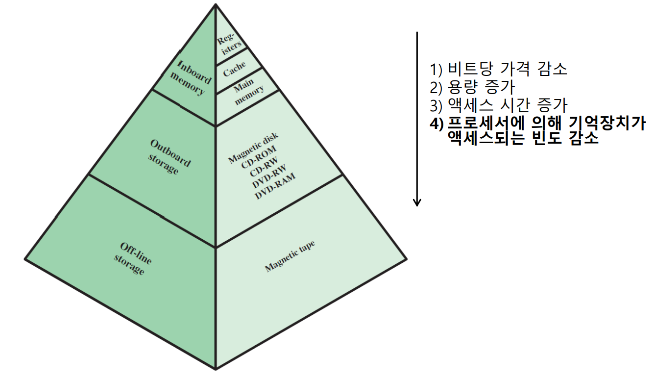 - 용량이 커질수록 비트에 대한 가격 감소, 엑세스 속도가 감소하는 딜레마에 빠지게 되며 설계자들은 용량은 비교적 적더라도 엑세스 속도가 빠른 기억장치를 사용할 수밖에 없게 되고, 이러한 문제를 해결려면 한 가지 기술에 의존하는 것보단 기억 장치 계층(Memory hierarchy)을 이용함으로써 해결할 수 있습니다.