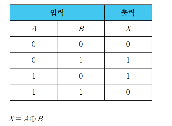 - 두 개의 입력에 대해 입력값이 같으면 0, 다르면 1을 출력하게 됩니다.