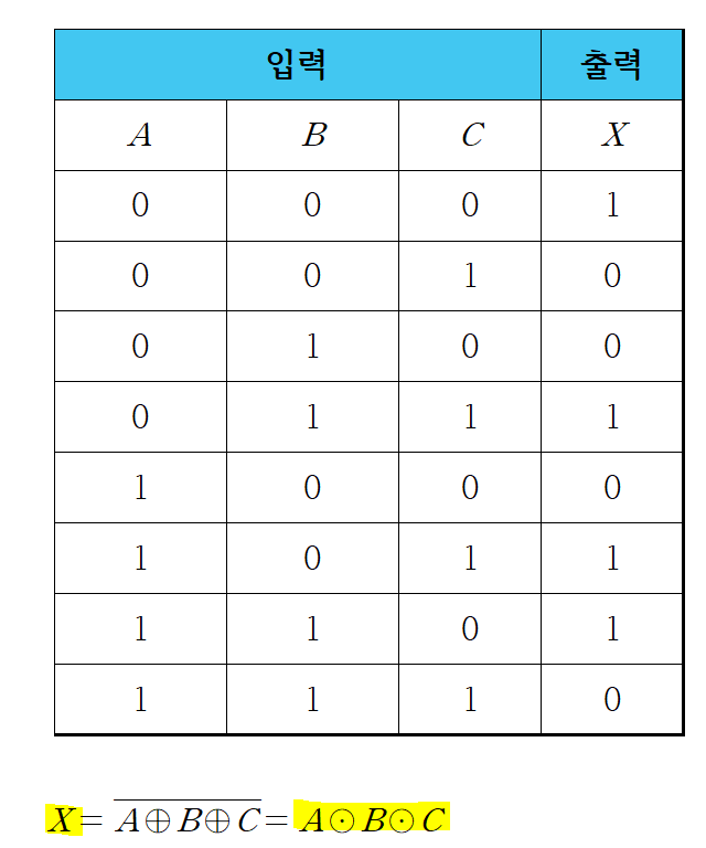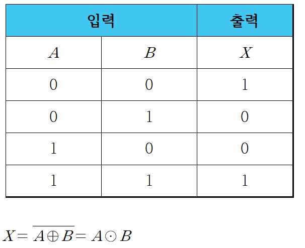 - XNOR 게이트(Exclusive NOR Gate)는 1을 홀수 개 입력하면 0, 짝수 개 입력하면 1을 출력합니다.