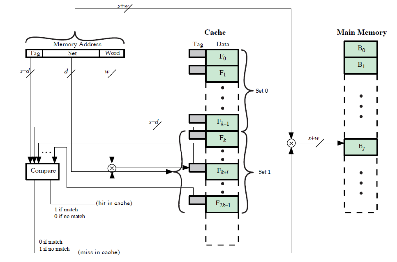 - 세트 연관 캐시는 k개의 직접 사상 캐시들로 구현이 가능합니다.