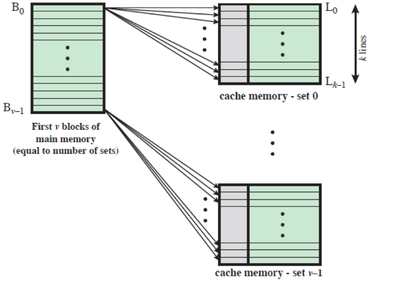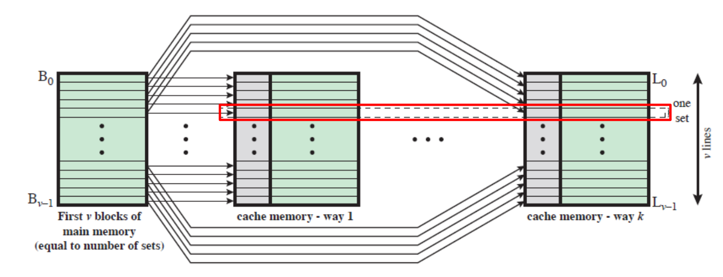 - 세트 연관 캐시는 물리적으로 v개의 연관 캐시들로 구현이 가능합니다.
