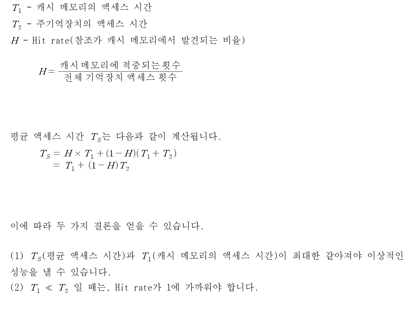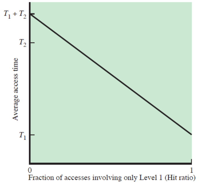 - 캐시의 적중률(Hit rate)가 높아질수록, 평균 기억장치의 액세스 시간은 캐시 메모리 액세스 접근 시간과 비슷해집니다.