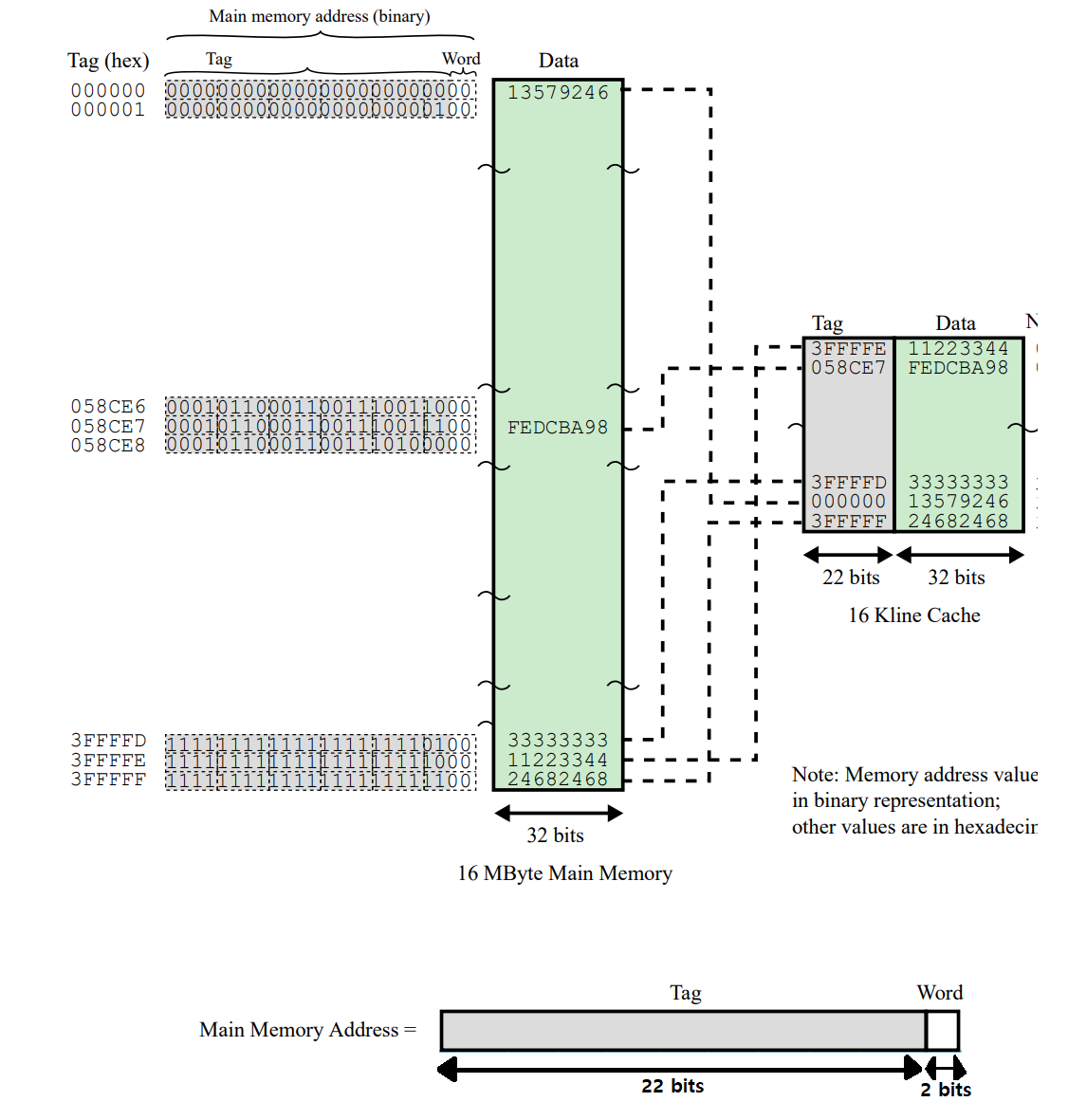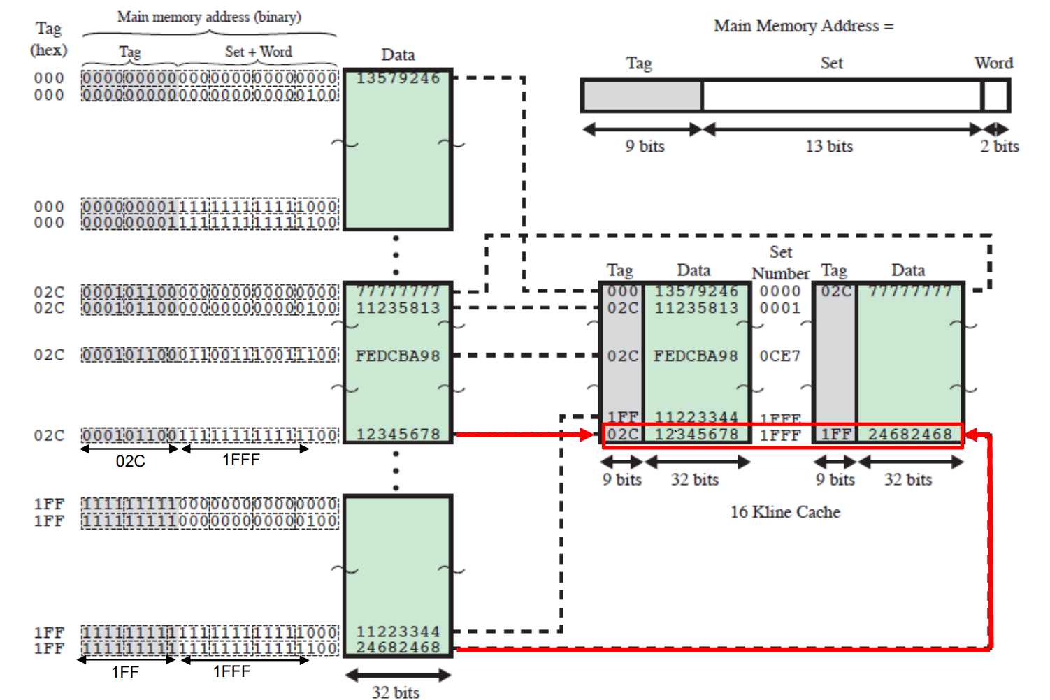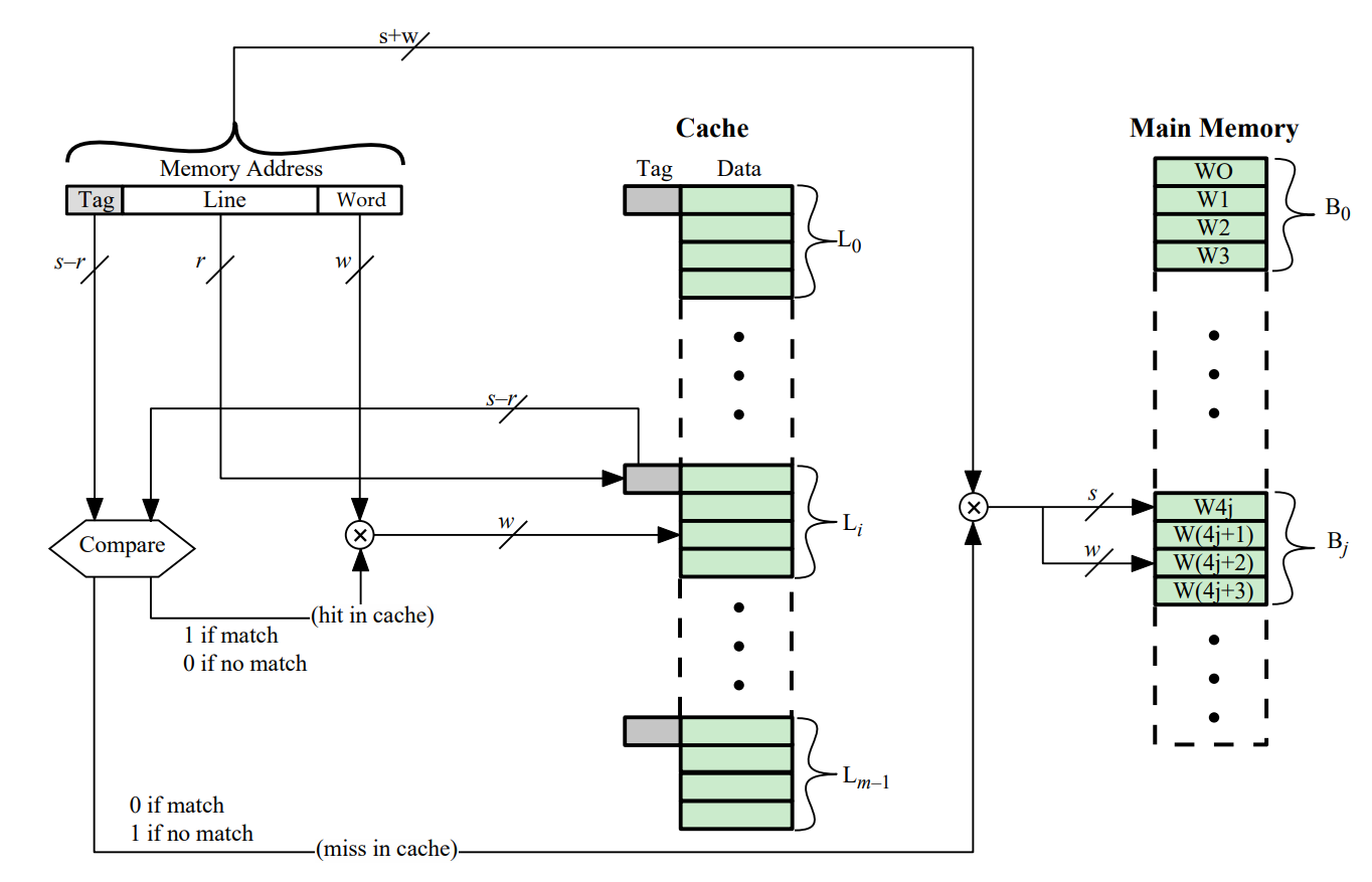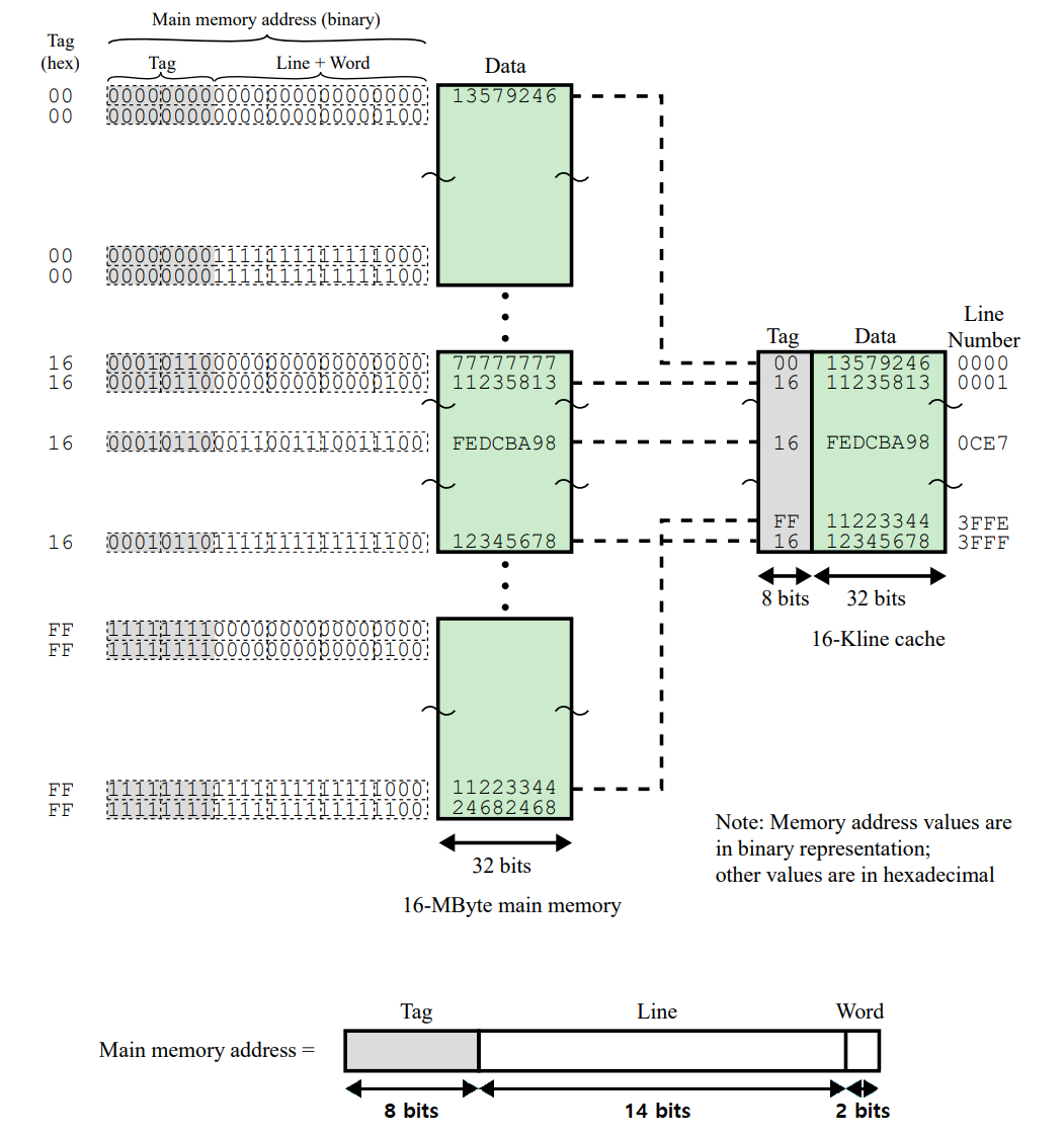 - 결과적으로 캐시의 각 슬롯에는 태그와 데이터 블록이 함께 저장되며 캐시 적중 여부는 주소의 기억장치의 주소 태그 비트들과 캐시 슬롯에 저장된 태그 비트들을 비교함으로써 결정됩니다.