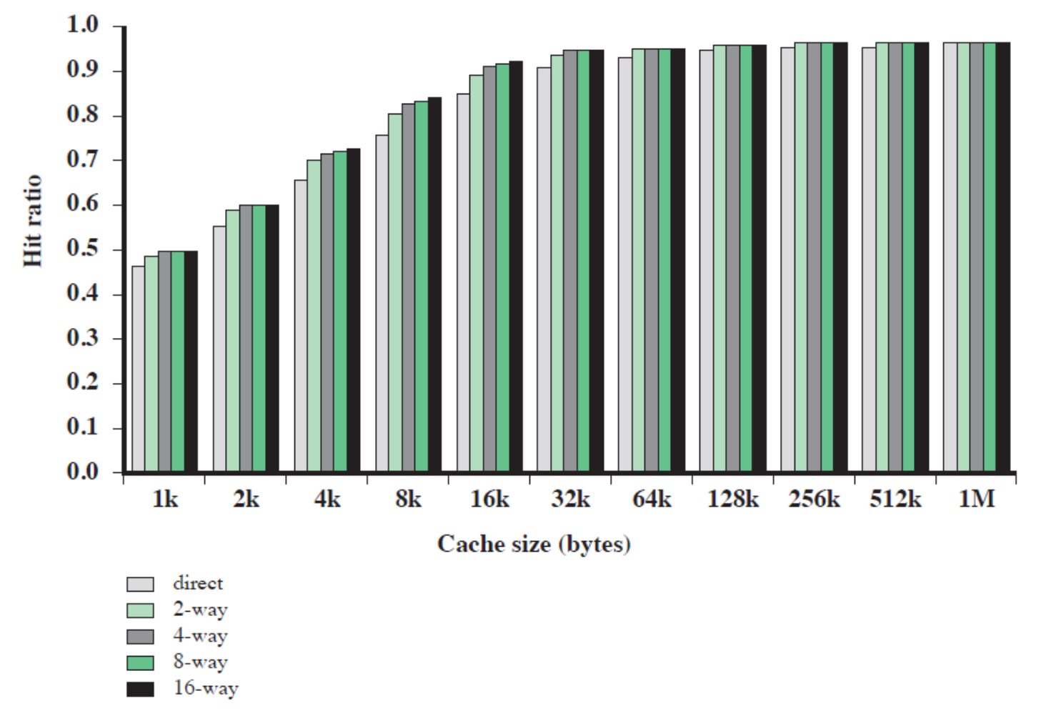 - 직접 사상과 2-way 세트-연관 사상 간의 성능 차이는 캐시 크기가 적어도 64 KB가 될 때까지는 상당히 큰 편입니다.