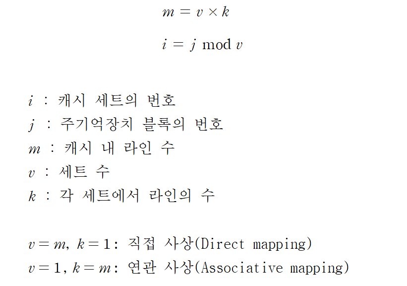 - 사상 함수는 직접 사상(Direct mapping), 연관 사상(Associative mapping), 세트 연관 사상(Set associative mapping)이 있습니다.