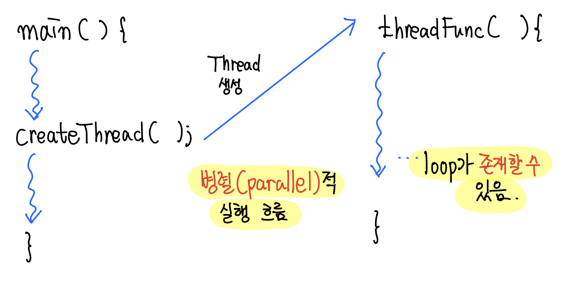 스레드가 호출되어도 기존 메인 함수는 지속적으로 수행되는 병렬적(Parallel) 흐름이 수행되기 때문입니다.