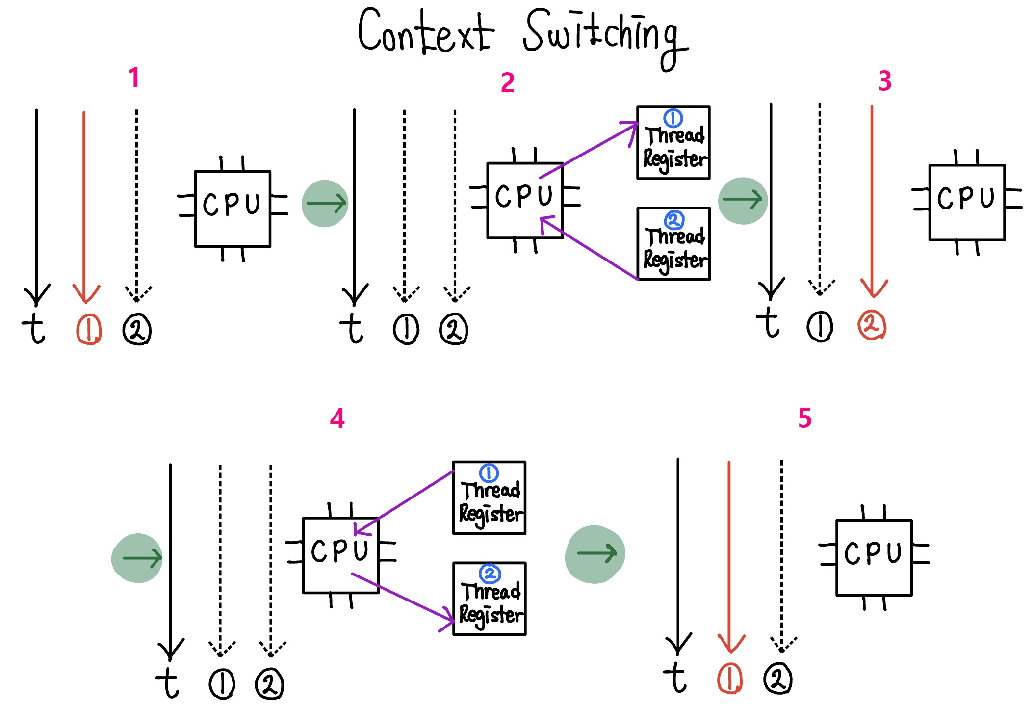 - CPU와 운영체제가 동시에 동작하여 이러한 스레드의 실행 상태의 저장, 복원 작업을 컨텍스트 스위칭(Context Switching)이라고 합니다.