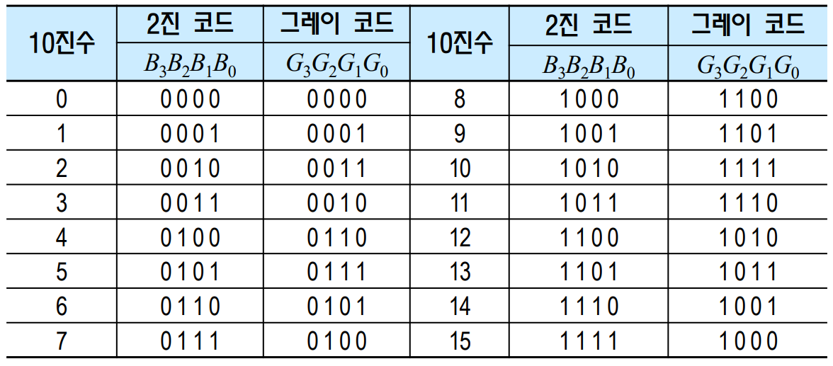 - 아래의 표는 4비트 2진 코드를 그레이 코드로 변환하는 진리표이며, 그에 해당하는 논리 회로입니다.