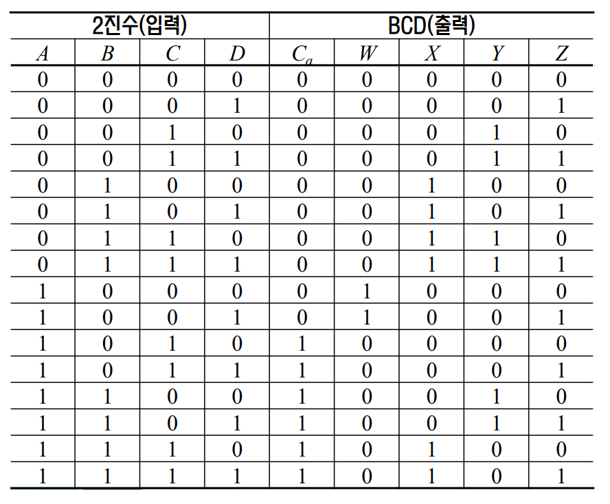 - 단, 2진수가 10 이상일 때 6을 더해 보정하여 BCD 코드로 변환합니다.