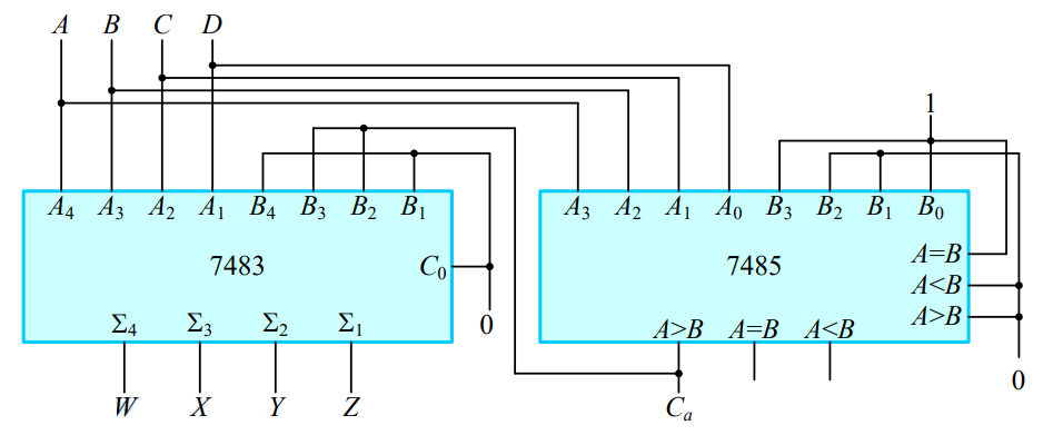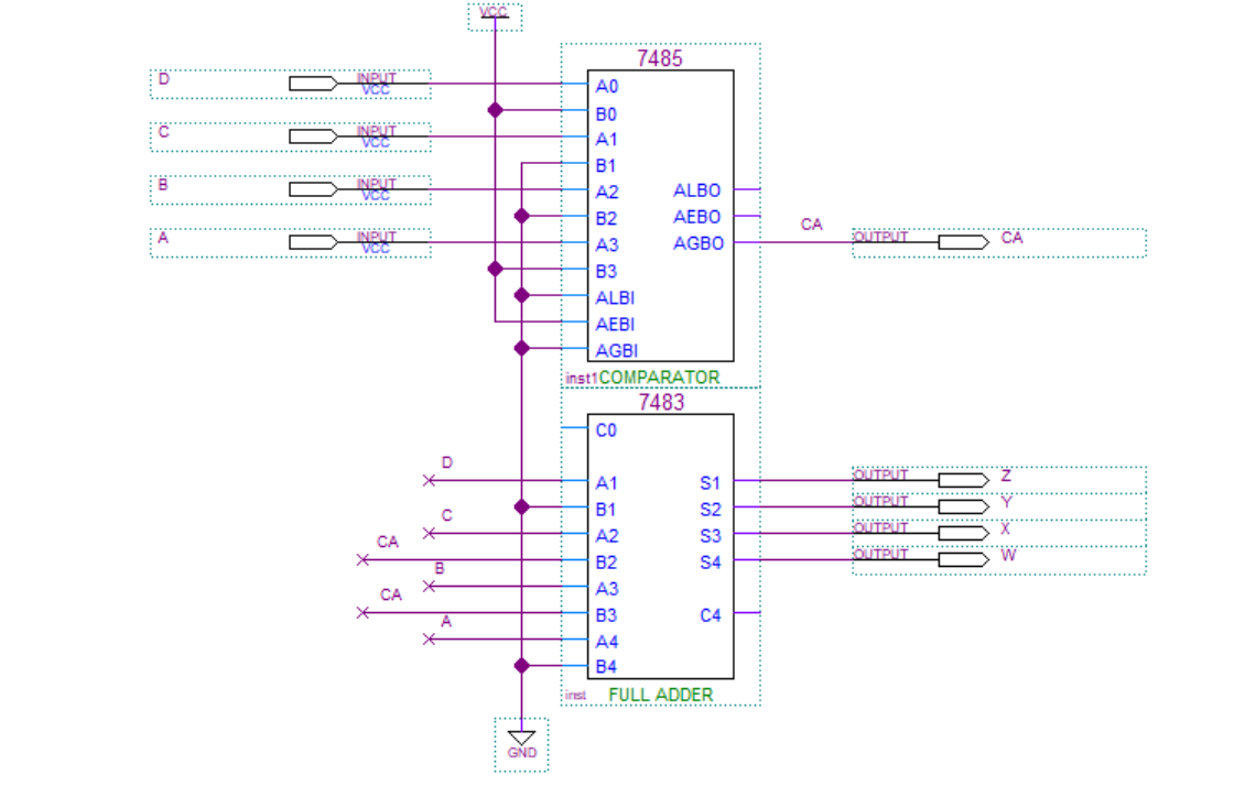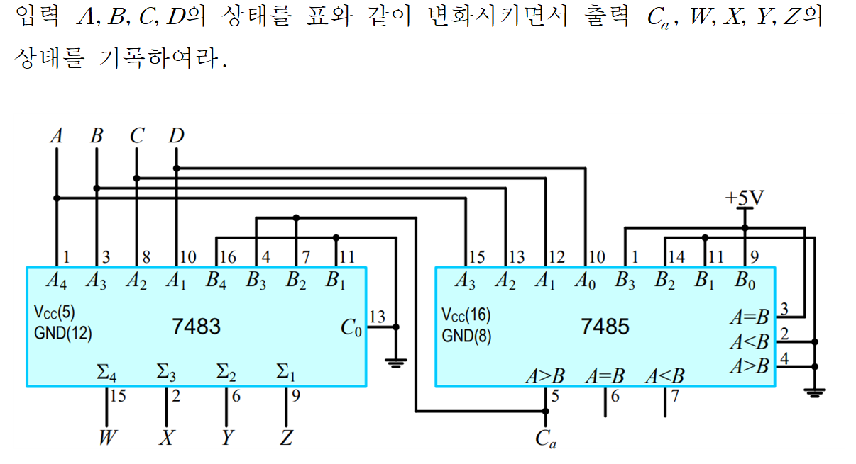 - 4비트 비교기 7485와 4비트 가산기 7483을 이용한다면 아래와 같이 회로를 설계할 수 있게 됩니다.