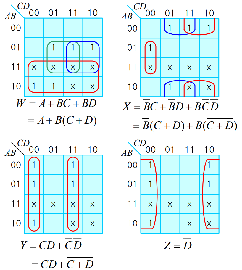- BCD 코드의 경우 0~9(0000~1001)만 사용하므로 나머지 10~15(1010~1111)는 무관항(Don't care)으로 처리합니다.