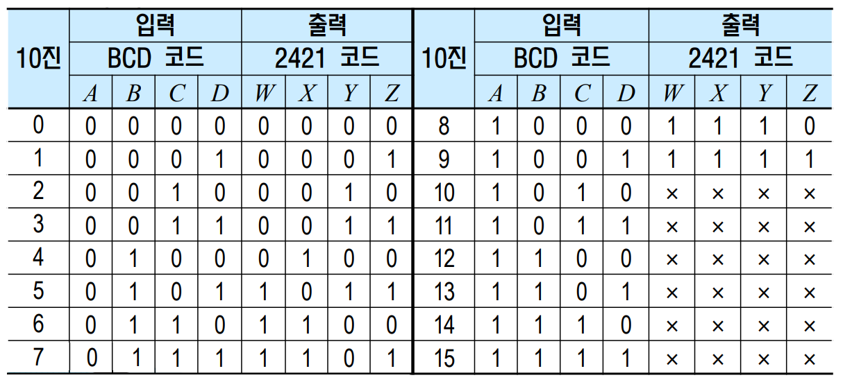 2421 코드는 대표적인 가중치 코드이며 BCD 코드를 2421 코드로 변환할 때는 BCD가 숫자 10개만 사용하므로 1010~1111 6개는 무관항(Don't care)으로 처리하며 카르노 맵을 이용하여 간략화할 수 있습니다.