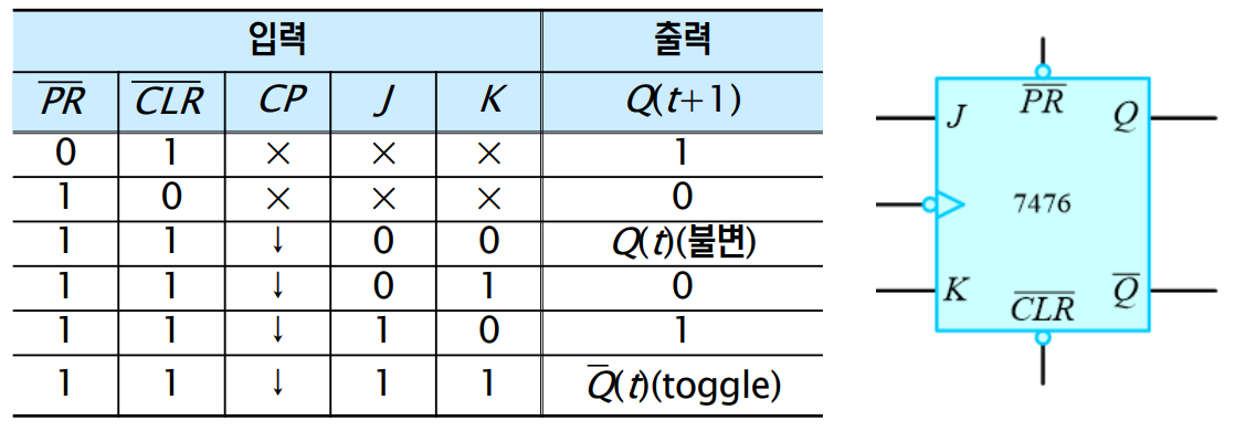 - 7476 회로에는 하강 에지 트리거에서 동작하는 JK 플립플롭 2개가 내장되어 있습니다.