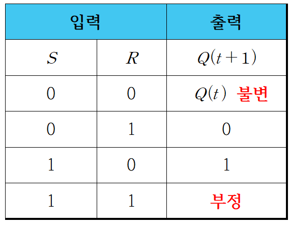 - SR 래치 회로에는 S(Set)와 R(Reset)로 표시된 입력 2개와 Q, Q'로 표시된 출력 2개가 존재하며 Q, Q'는 서로 보수가 되어야 정상 상태가 됩니다.