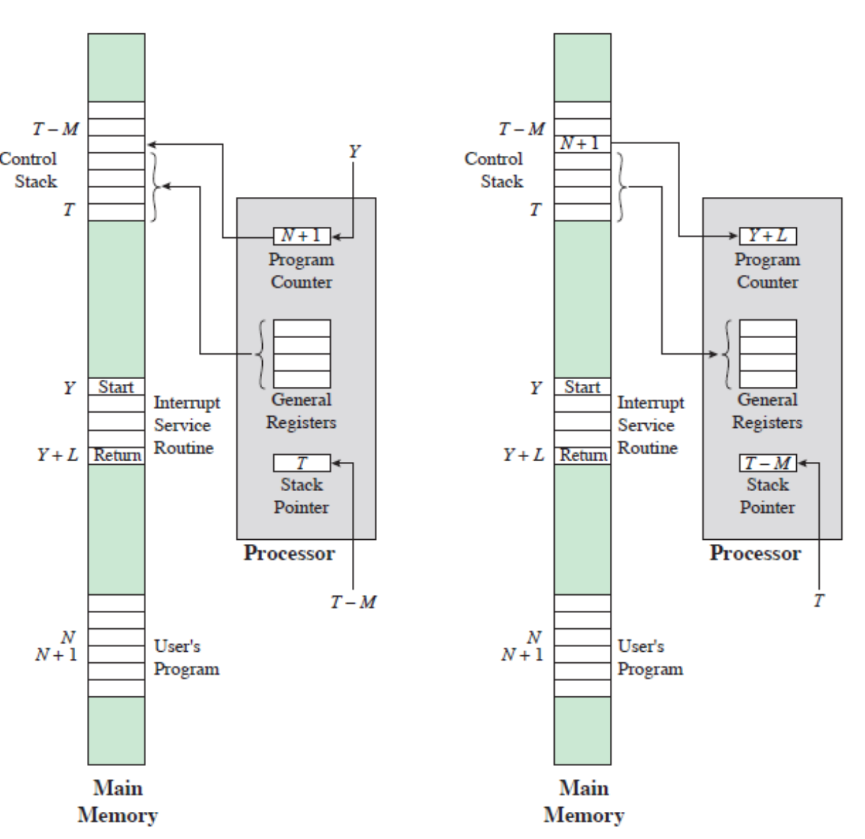 - 인터럽트 처리가 완료되면, 저장된 레지스터의 내용들이 스택으로부터 인출되어 레지스터들로 복원됩니다.