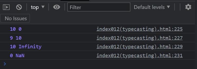console.log('abc' / 10, typeof ('abc' / 10)) // Nan "number"