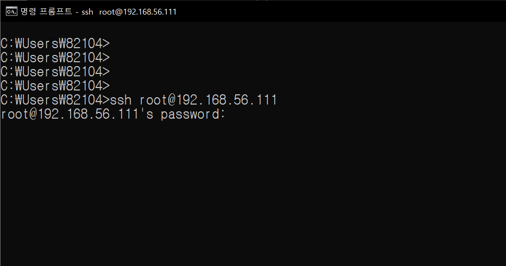 (4) Windows 커맨드 프롬프트에 접속하여 ssh root@192.168.56.111을 입력하고 명령을 내리면 아래와 같이 현재 루트 계정에 대한 비밀번호가 설정되어 있으므로 비밀번호를 묻는 텍스트가 나타납니다.