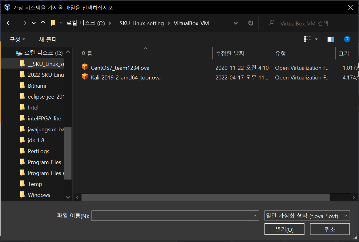 - 실습 환경에서 제공된 CentOS, Kali Linux 파일을 각각 따로 선택해 주어 2개의 가상 환경을 구성해야 합니다.