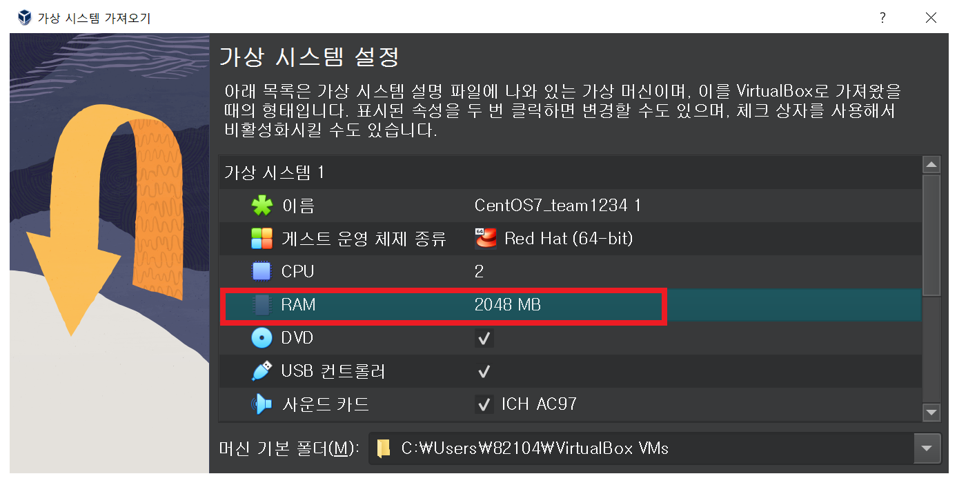 (3) .ova 파일을 선택한 후 가상 시스템의 자원을 설정해 줄 수 있습니다 해당 페이지에서는 RAM의 크기를 최소한 2,048 MByte 크기로 설정해 주고 "Finish"를 클릭하여 설정을 완료할 수 있습니다