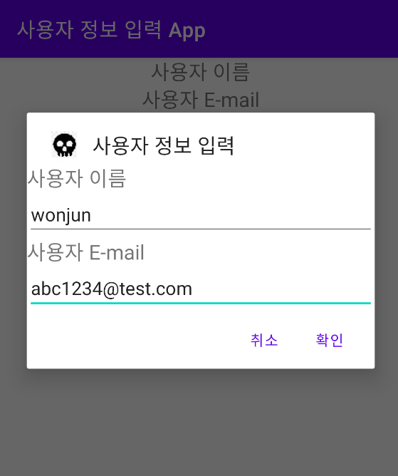 - 만약 취소 버튼을 클릭하면 설정한 Toast message가 출력되며 정보 입력 대화 상자가 종료됩니다.