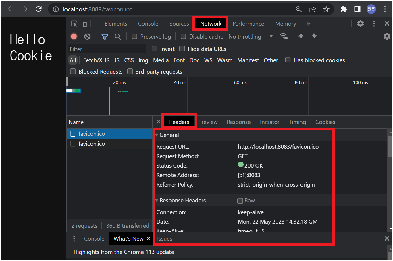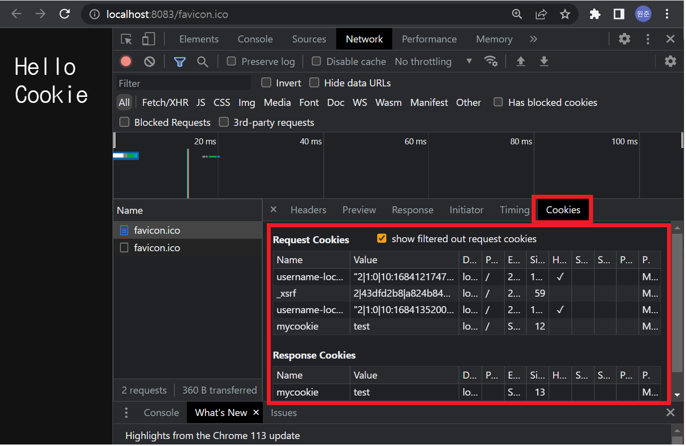 (2) favicon.ico의 경우 브라우저가 자동으로 보내는 요청으로 두 번째 요청인 favicon.ico가 쿠키 데이터에 삽입됩니다.