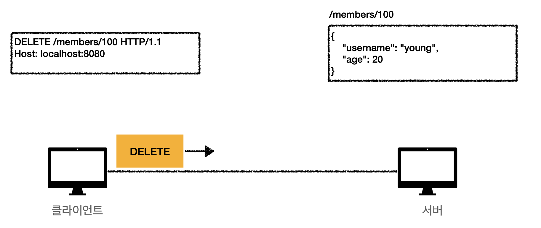 (1-a) 아래와 같이 클라이언트에서 /members/100 경로로 데이터 조회를 GET 메서드로 요청합니다.