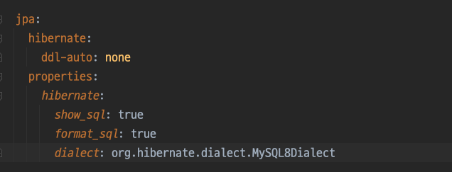 - MySQL을 사용하고 있으므로 org.hibernate.dialect.MySQL8Dialect을 적는다.