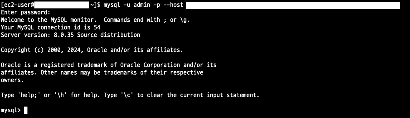 mysql -u [RDS 생성 시 지정한 사용자명] -p --host [RDS 접속 엔드포인트 주소]