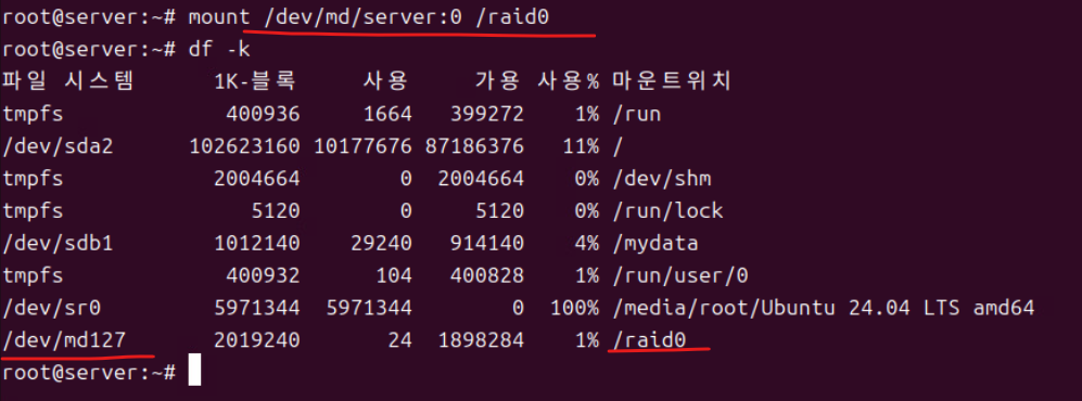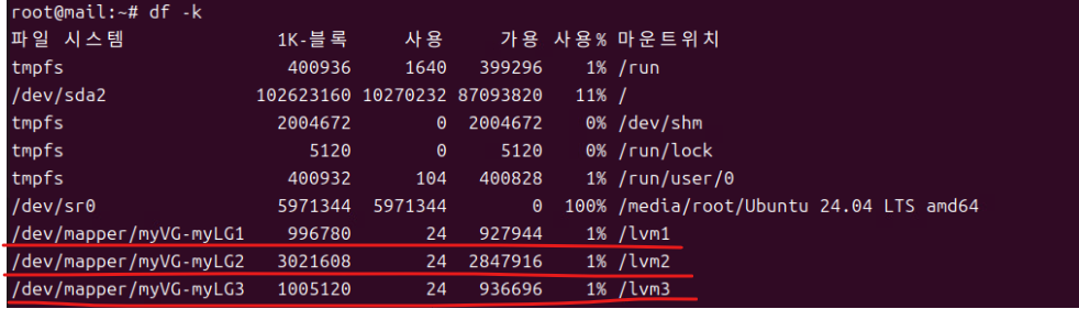 (5) 이후 df -k로 마운트 내역을 확인한다.