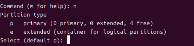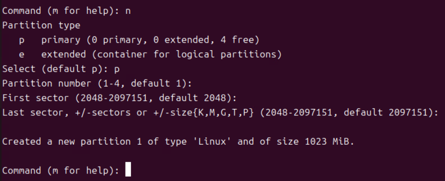 (5) n 커맨드로 파티션 타입을 p로 주고 First, Last sector 값을 모두 기본값으로 준다. (Sector 값의 경우 Enter 개행을 주면 자동으로 기본값이 지정된다.)