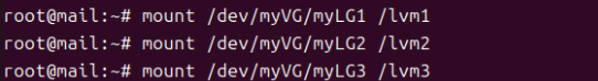 (14) mount /dev/myVG/myLG1 /lvm1, mount /dev/myVG/myLG2 /lvm2, mount /dev/myVG/myLG3 /lvm3