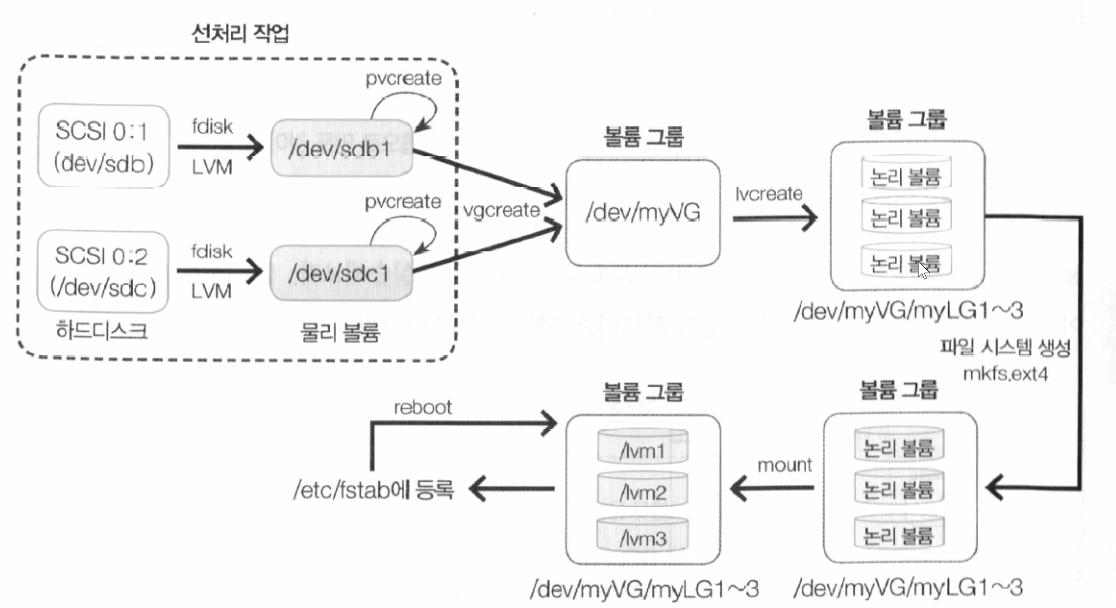(2) LVM은 여러 개의 하드 디스크를 합쳐서 한 개의 파티션으로 구성한 후 다시 필요나 목적에 맞게 적절히 나누는 디스크 관리 기술을 말한다.