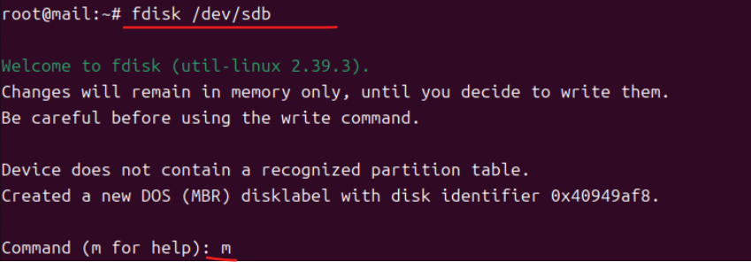 (4) m 커맨드를 줘서 파티션 테이블을 생성한다.