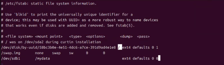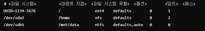 (5) 재부팅 이후에도 마운팅 환경을 영구적으로 유지하기 위해 nano 또는 geditor를 통해 /etc/fstab 디렉터리를 열어서 아래와 같은 구문을 추가한다.